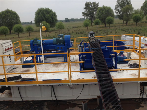 井口出來(lái)的泥漿通過(guò)分流箱輸送到振動(dòng)篩,經(jīng)過(guò)振動(dòng)篩處理后進(jìn)入振動(dòng)篩罐倉(cāng)內(nèi),隨后通過(guò)自流進(jìn)入除氣器罐的除氣倉(cāng);通過(guò)除氣泵經(jīng)過(guò)除氣器處理后的泥漿進(jìn)入除砂倉(cāng),除砂泵抽吸除砂倉(cāng)內(nèi)泥漿輸送至除砂旋流器,除砂旋流器處理后的泥漿進(jìn)入除泥倉(cāng),除泥泵吸入除泥倉(cāng)的泥漿輸送至除泥旋流器,除泥旋流器處理后的泥漿進(jìn)入中間罐的離心機(jī)吸入倉(cāng),隨后經(jīng)過(guò)離心機(jī)供料螺桿泵輸送至離心機(jī),經(jīng)離心機(jī)處理后的泥漿進(jìn)入離心機(jī)排出倉(cāng),完成一個(gè)鉆井液泥漿處理流程后,由鉆井泵重復(fù)泵入井內(nèi)循環(huán)使用。